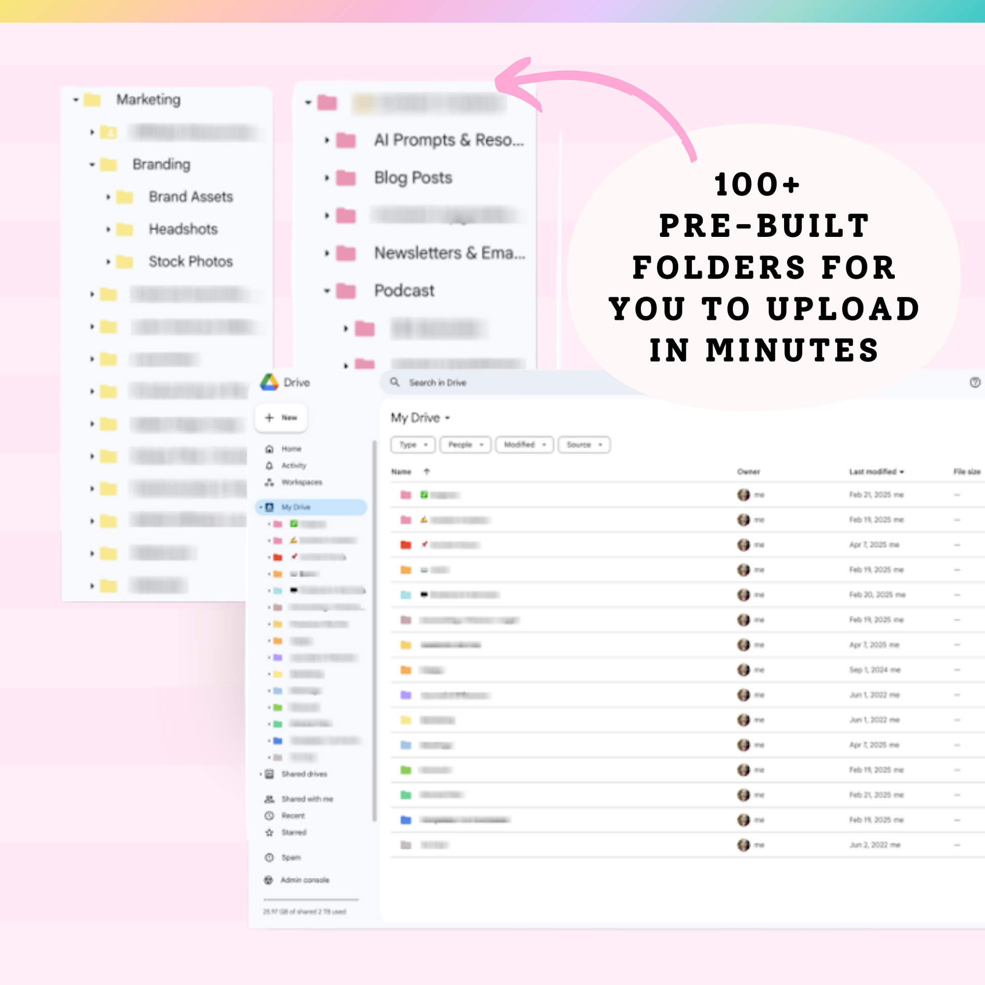 - 📊 Instantly upload my pre-built Google Drive Folder Structure and get organized in minutes! Includes 100+ folders pre-named and created for you