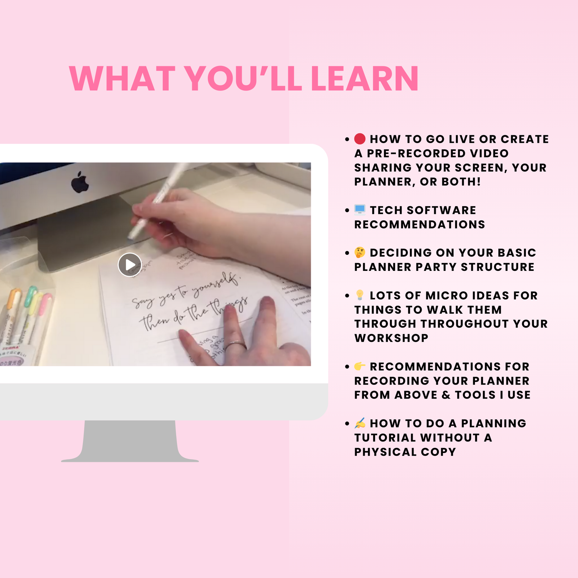 Get the technical setup for hosting your very own planning party! Use a planner you've created or a blank notebook or whiteboard to lead your audience through a process, reflection, or journaling session!